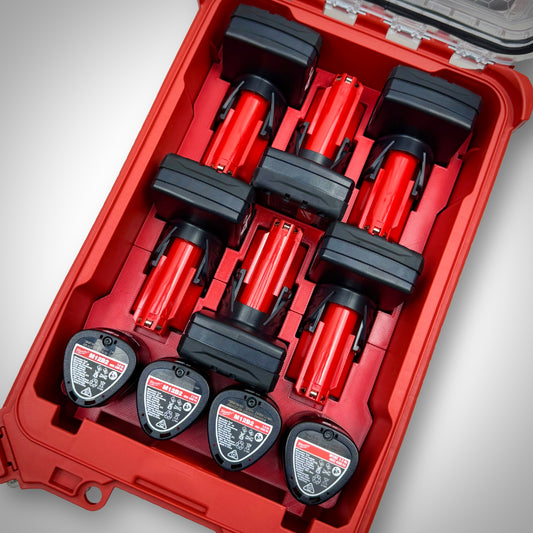 Keep your batteries organized and ready to go. Our inserts for PACKOUT boxes and drawers neatly store Milwaukee M12 & M18, Makita 18V/40V, and Dewalt batteries, making transport effortless and ensuring you're always powered up.