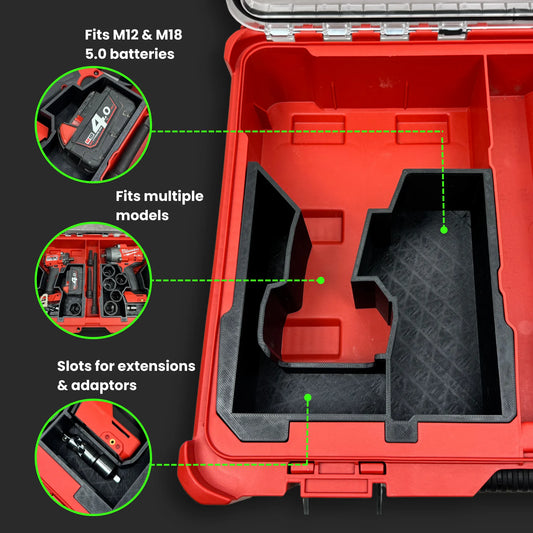 Custom inserts and organisers designed for the Milwaukee PACKOUT™ Organiser (48-22-8430). Perfect for batteries, sockets, fittings, and small tools, these inserts keep everything locked in place so it’s not sliding around in the trays. Turn your organiser into a proper, site-ready kit with storage that actually works the way you need it to.