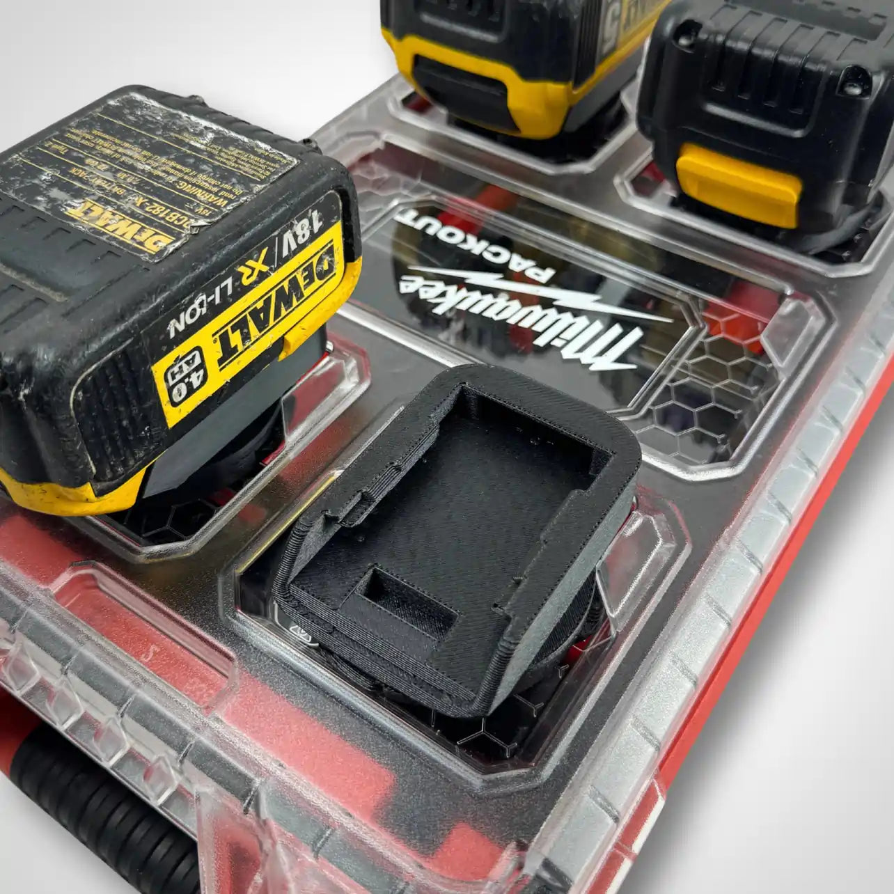 UNIVERSAL FIT: Designed to hold any size Dewalt 18V battery securely on the lid of ANY PACKOUT Organiser or PACKOUT Toolbox.