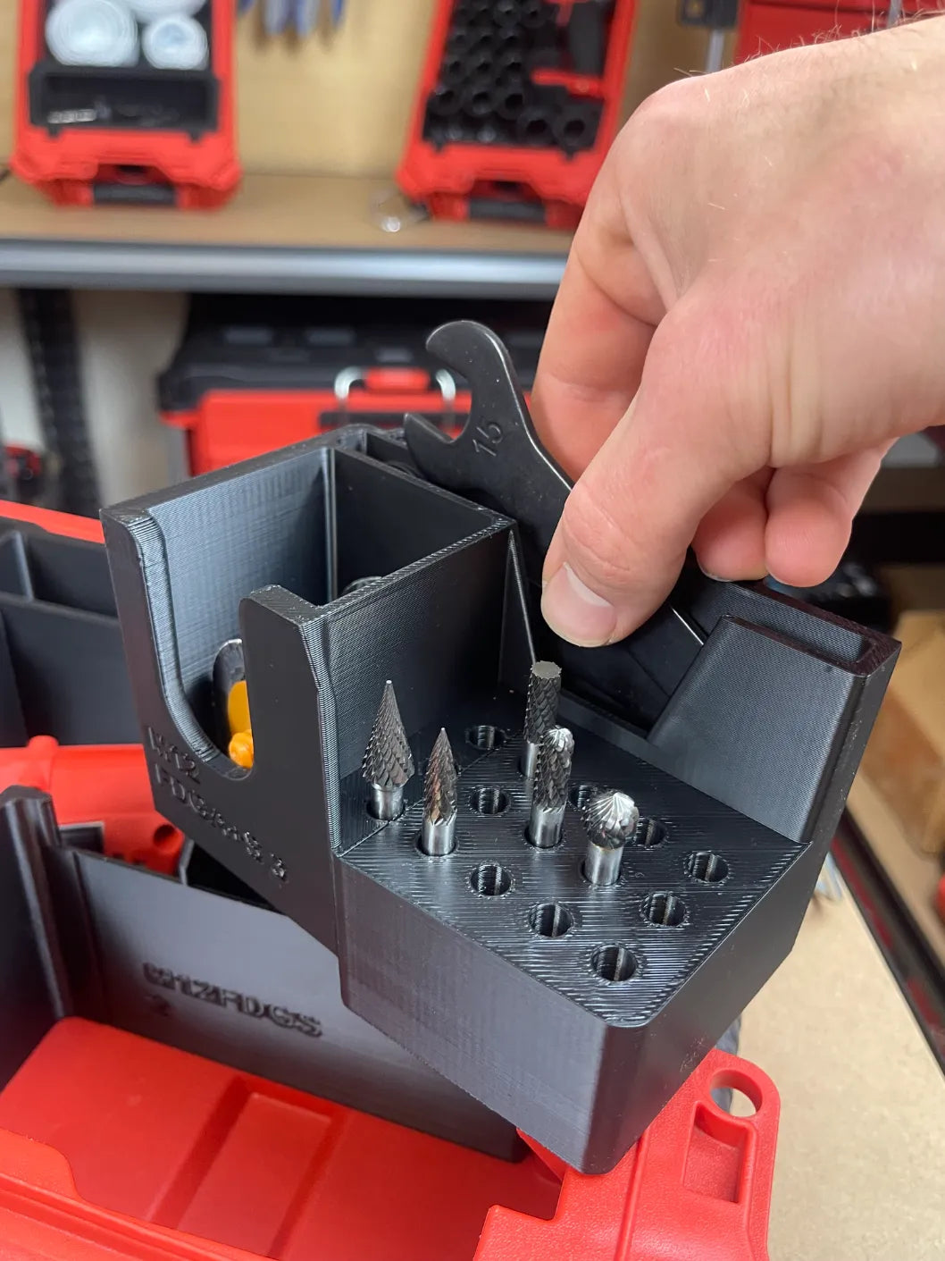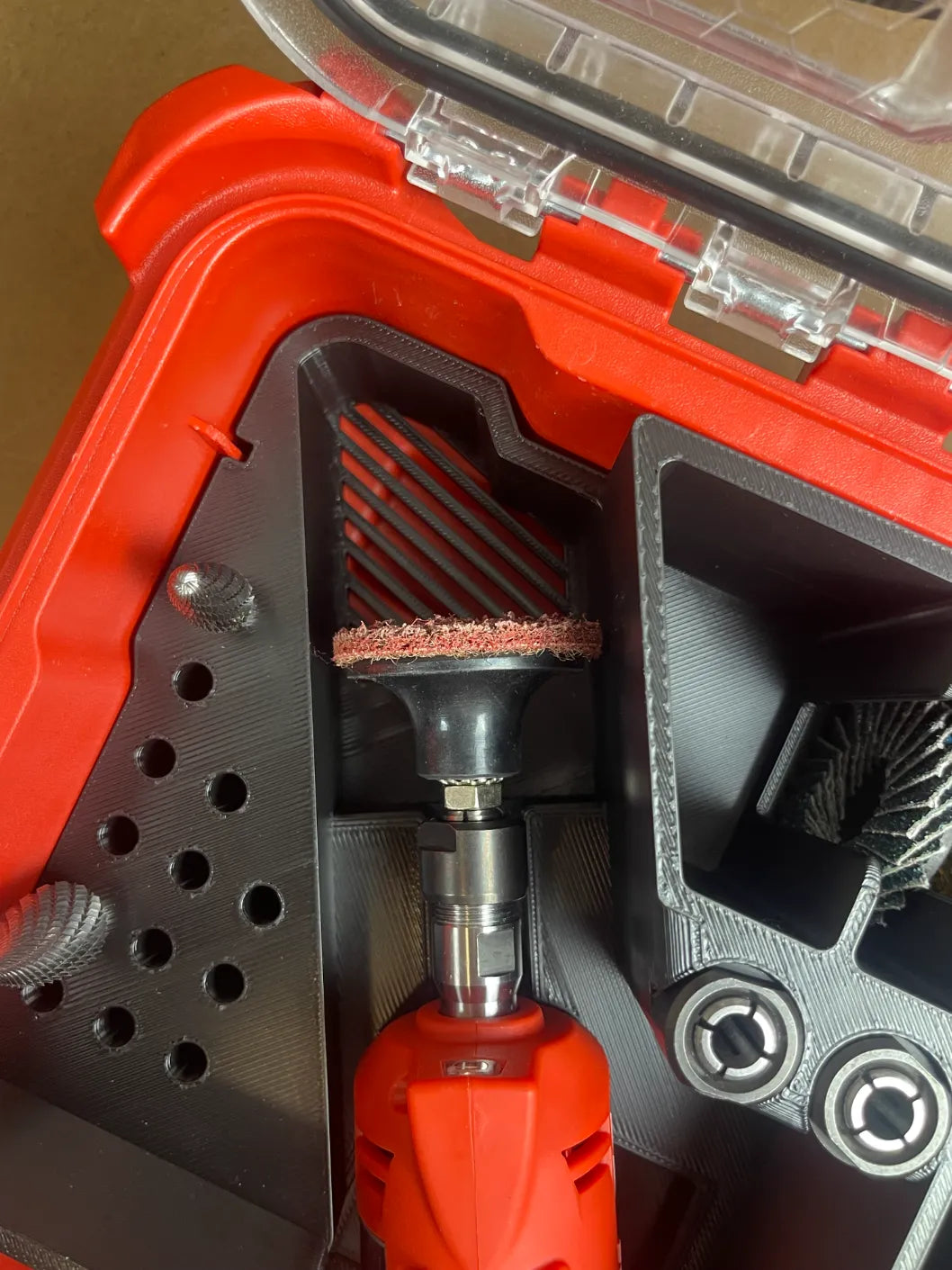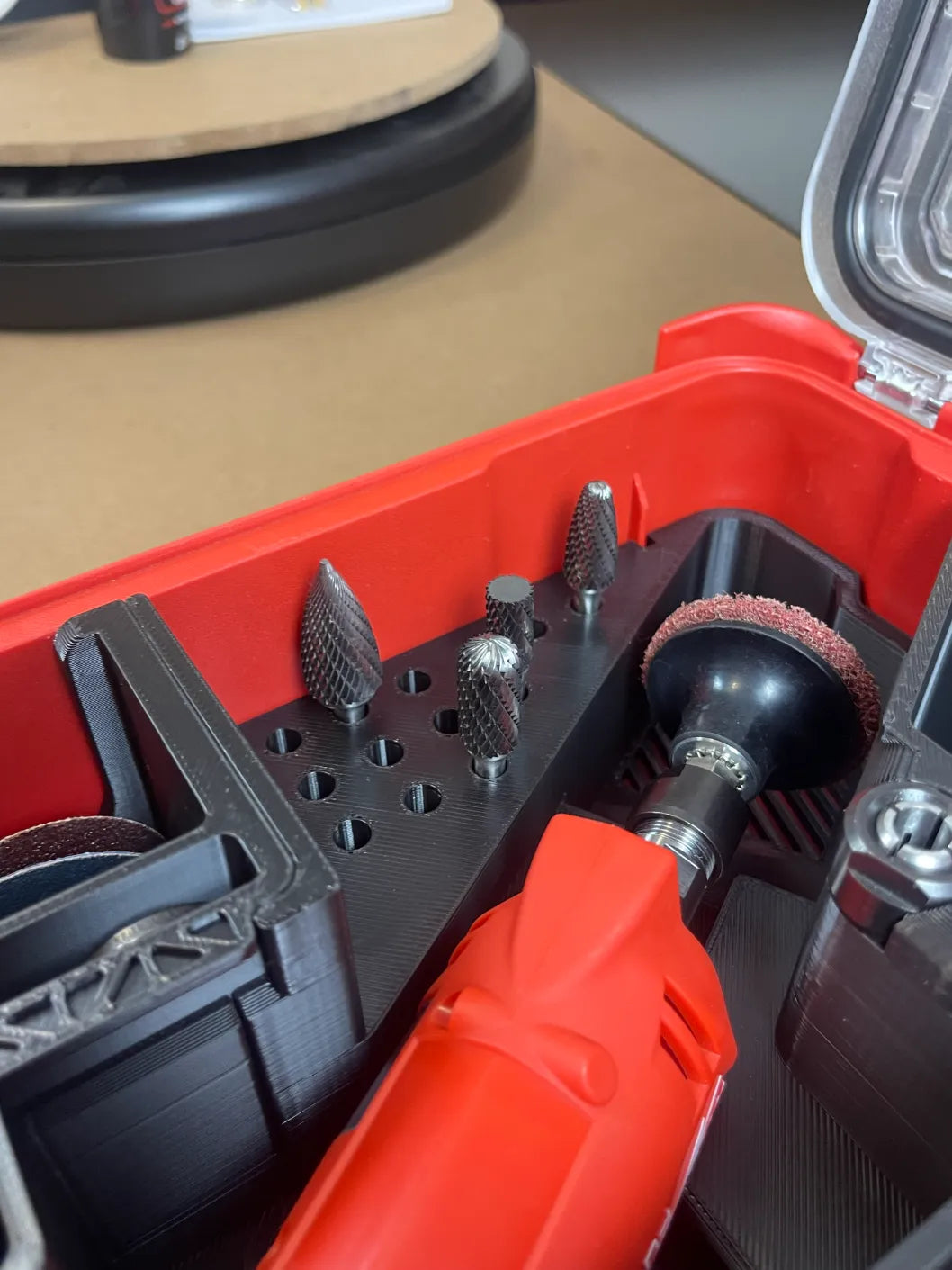 Removable tray stores heads, discs, and wrenches with reinforced walls and glove-friendly shaping.