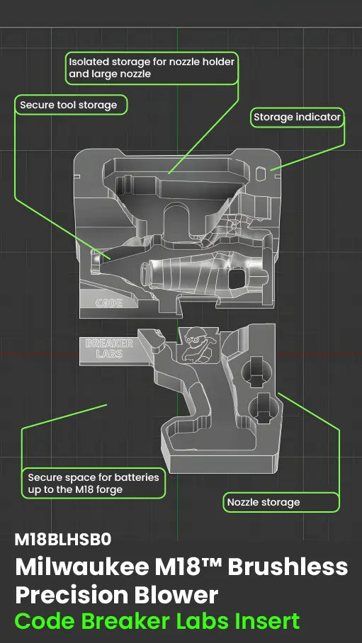 Still tossing your blower and nozzles into the box? This insert holds your M18 Precision Blower, attachments, and even an 6Ah FORGE battery in a clean, secure layout.